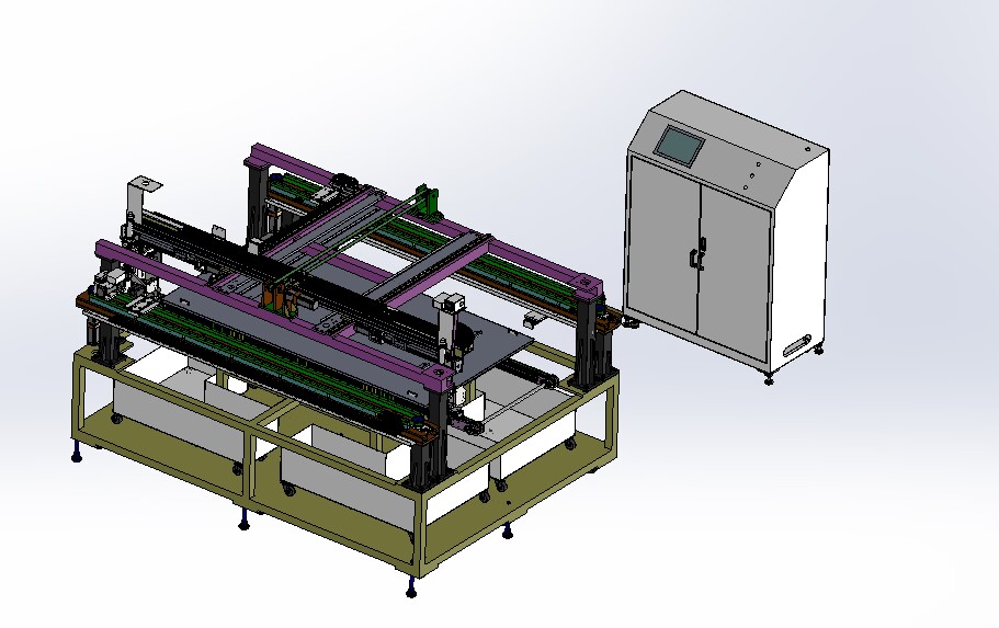自動排版機的主要功能單元有:玻璃輸送定位系統、抓取行走系統、視覺檢測系統、電控系統等;通過以上功能單元,實現了將自動串焊機串焊好的電池串,按照工藝尺寸要求和排版方向順序自動排版鋪設到玻璃(EVA已經鋪設)上,組成電池串陣列。玻璃/EVA通過傳輸線傳輸至指定位置,機械手抓取電池串實現CCD定位、自動旋轉、自動排版功能。設備通過同步帶傳輸與自動生產線對接,實現了自動流水作業。